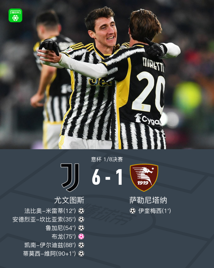 北京时间1月5日意杯1/8决赛,尤文图斯主场对阵萨勒尼塔纳。上半场开场1分钟,加蒂送礼,伊奎梅西为客队取得领先。坎比亚索助攻米雷蒂扳平比分,随后坎比亚索帮助尤文反超。下半场,鲁加尼门前补射扩大领先优势。伊尔迪兹射门造成对方乌龙,随后伊尔迪兹梅西附体般连过三人取得进球。读秒阶段,维阿轰入世界波。全场比赛结束,尤文6-1大胜萨勒尼塔纳,成功晋级意大利杯八强。