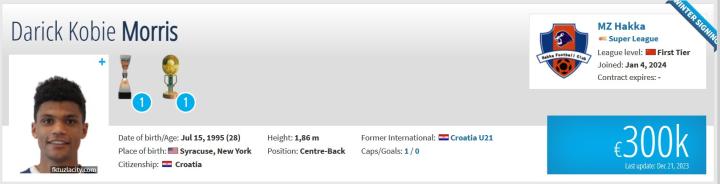达里克-莫里斯,现年28岁,德转身价30万欧元,身高186cm,司职后卫,右脚球员,本赛季效力于斯洛文尼亚甲级联赛的穆拉队,代表球队出场15次。