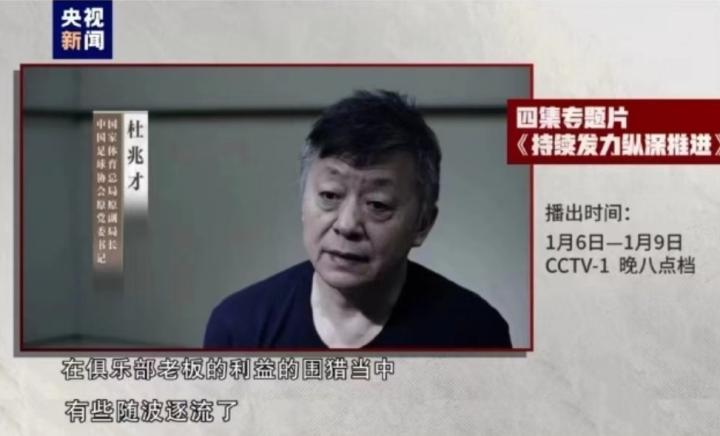 1月5日,央视新闻发布年度反腐专题片《持续发力 纵深推进》的预告,片中将披露足球领域腐败案细节,国家体育总局原副局长杜兆才、足协原主席陈戌源、国足原主教练李铁在镜头前忏悔。