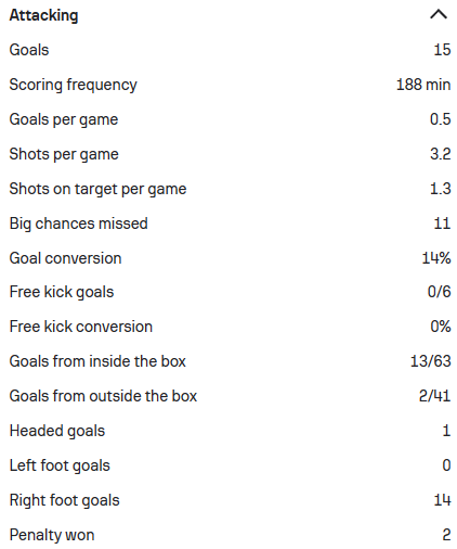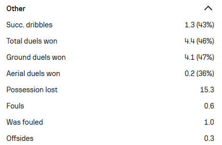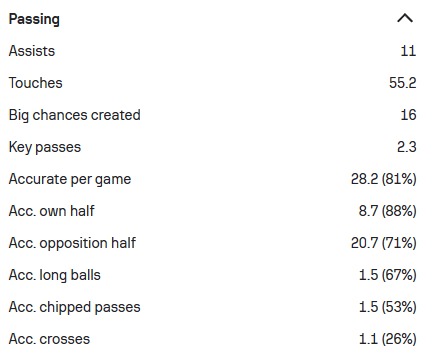 (2022/2023赛季的部分进攻相关数据,可以看到在制造机会和场均关键传球方面贡萨尔维斯的表现都可以用优秀来形容,进球的转化率以及整体的传球成功率都当之无愧是球队的“大腿”。)