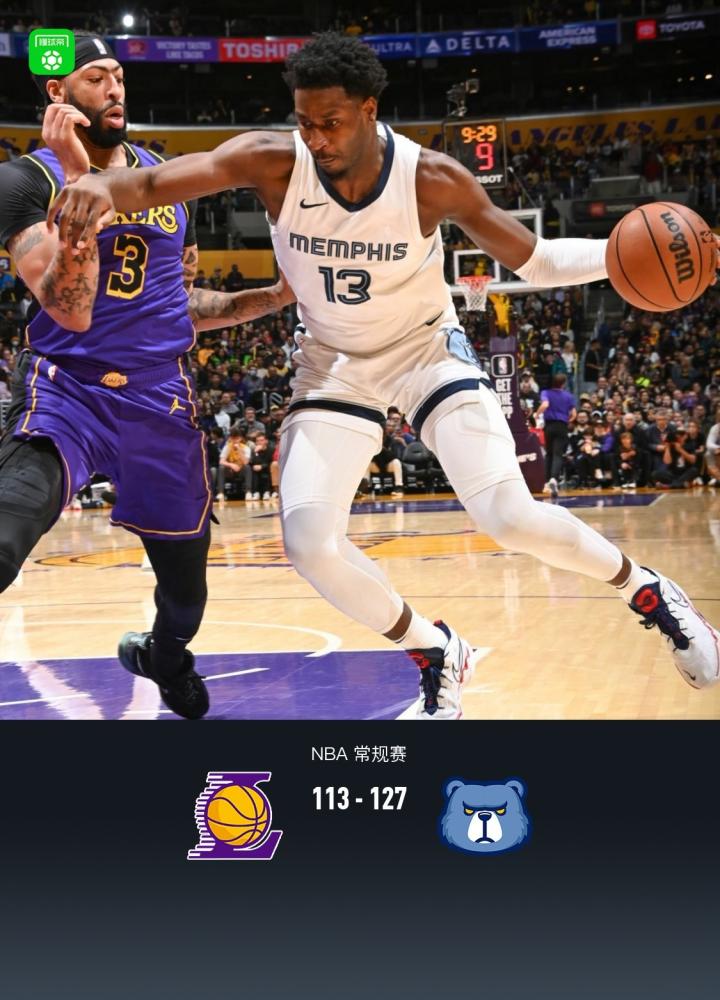 第四节湖人戴维斯拿下6分,灰熊扎伊尔-威廉姆斯拿下10分,最终湖人113-127不敌灰熊