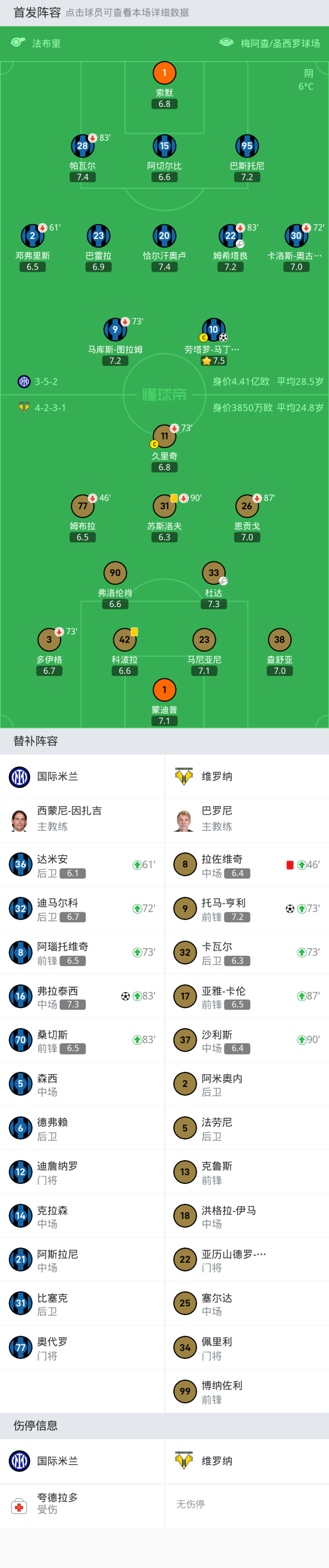 上场替补:83'70-桑切斯, 61'36-达米安, 73'8-阿瑙托维奇, 72'32-迪马尔科, 83'16-弗拉泰西