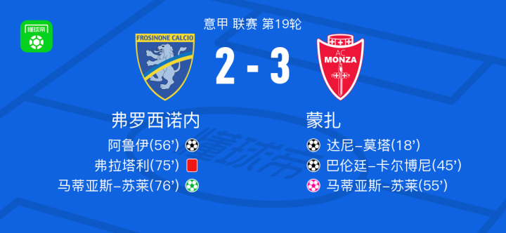北京时间1月6日意甲 联赛 第19轮,弗罗西诺内主场对阵蒙扎。弗罗西诺内阿鲁伊破门,马蒂亚斯-苏莱破门,马蒂亚斯-苏莱自摆乌龙。蒙扎达尼-莫塔破门,巴伦廷-卡尔博尼破门。最终比分2-3。
