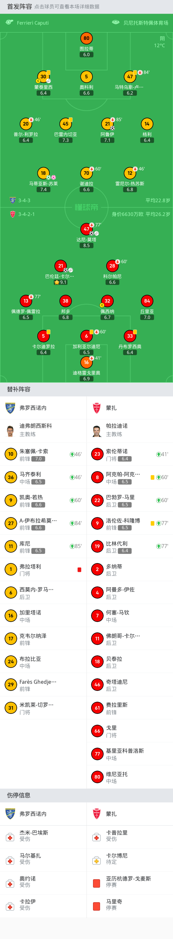 蒙扎首发:5-卡尔迪罗拉, 33-丹布罗西奥, 6-加利亚尔迪尼, 32-佩西纳, 84-丘里亚, 13-佩德罗-佩雷拉, 47-达尼-莫塔, 16-迪格雷戈里奥, 28-科尔帕尼, 38-邦多, 21-巴伦廷-卡尔博尼
