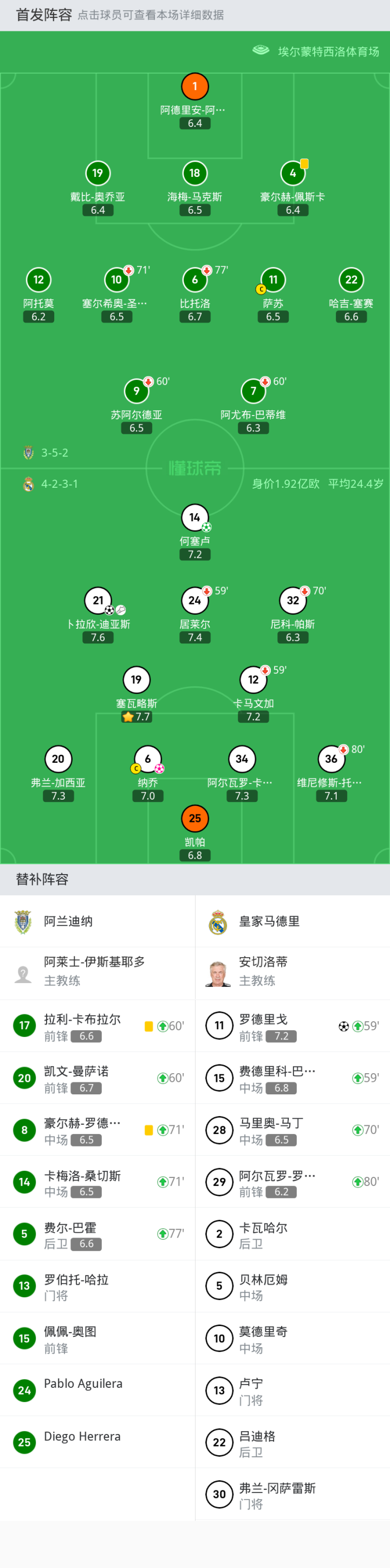皇家马德里首发:14-何塞卢, 6-纳乔, 25-凯帕, 19-塞瓦略斯, 21-卜拉欣-迪亚斯, 20-弗兰-加西亚, 12-卡马文加, 34-阿尔瓦罗-卡里略, 24-居莱尔, 32-尼科-帕斯, 36-维尼修斯-托比亚斯