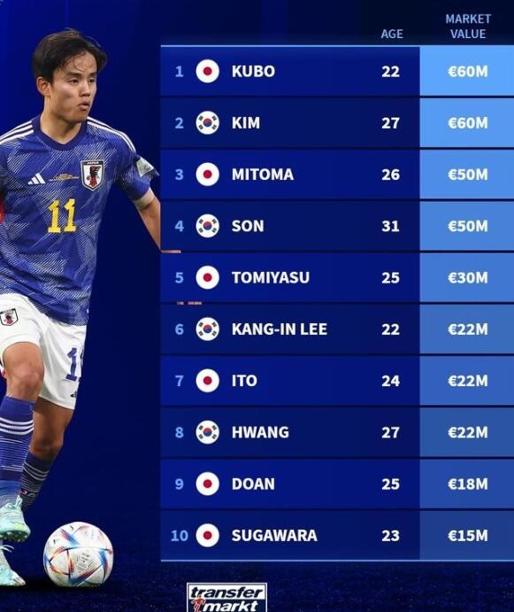 亚洲杯球员身价榜:日韩包揽前十,久保健英和金玟哉领衔