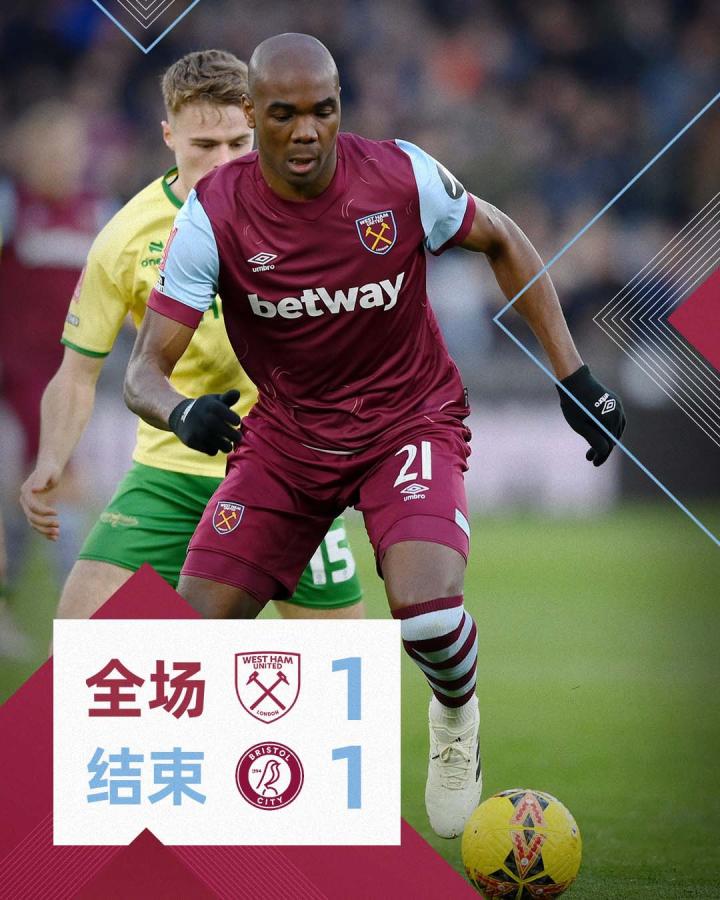 全场比赛结束 | 西汉姆联 1-1 布里斯托尔城...