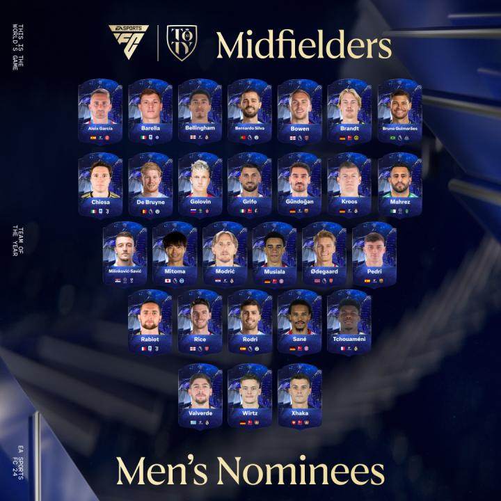 阿莱士-加西亚(赫罗纳)、巴雷拉(国际米兰)、贝林厄姆(皇家马德里)、伯纳多-席尔瓦(曼城)、鲍恩(西汉姆联)、布兰特(多特蒙德)、吉马良斯(纽卡斯尔联)、费德里科-基耶萨(尤文图斯)、德布劳内(曼城)、戈洛温(摩纳哥)、格里福(弗赖堡)、京多安(巴塞罗那)、克罗斯(皇家马德里)、马赫雷斯(吉达国民)、米林科维奇-萨维奇(利雅得新月)、三笘薰(布莱顿)、莫德里奇(皇家马德里)、穆西亚拉(拜仁慕尼黑)、厄德高(阿森纳)、佩德里(巴塞罗那)、拉比奥(尤文图斯)、赖斯(阿森纳)、罗德里(曼城)、萨内(拜仁慕尼黑)、楚阿梅尼(皇家马德里)、费德里科-巴尔韦德(皇家马德里)、维尔茨(勒沃库森)、扎卡(勒沃库森)