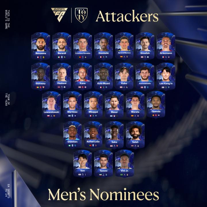 本泽马(吉达联合)、贝拉尔迪(萨索洛)、C罗(利雅得胜利)、登贝莱(巴黎圣日耳曼)、赫拉德-莫雷诺(比利亚雷亚尔)、格拉利什(曼城)、格列兹曼(马德里竞技)、吉拉西(斯图加特)、哈兰德(曼城)、凯恩(拜仁慕尼黑)、穆阿尼(巴黎圣日耳曼)、久保建英(皇家社会)、克瓦拉茨赫利亚(那不勒斯)、李刚仁(巴黎圣日耳曼)、莱万多夫斯基(巴塞罗那)、劳塔罗-马丁内斯(国际米兰)、姆巴佩(巴黎圣日耳曼)、梅西(迈阿密国际)、莫拉塔(马德里竞技)、奥蓬达(RB莱比锡)、奥斯梅恩(那不勒斯)、莱奥(AC米兰)、萨卡(阿森纳)、萨拉赫(利物浦)、孙兴慜(热刺)、塔雷米(波尔图)、维尼修斯(皇家马德里)