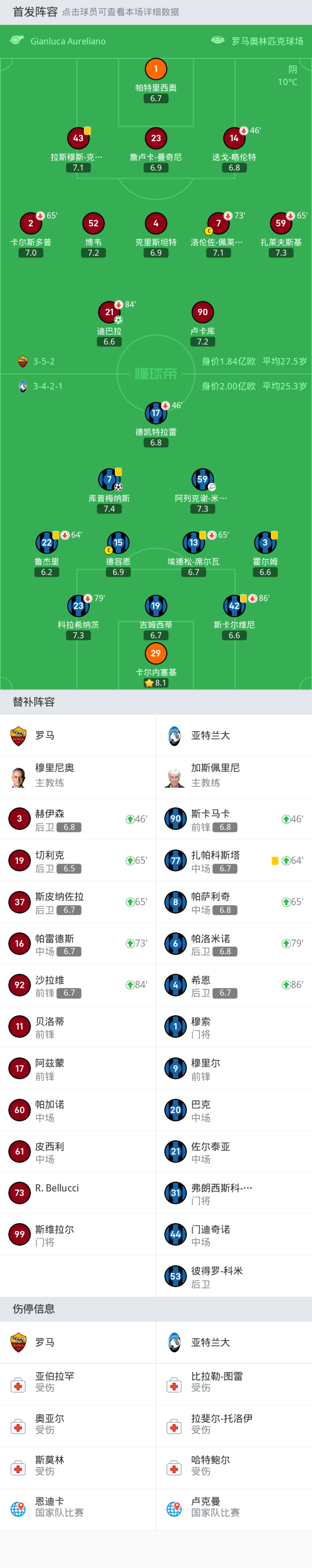 罗马首发:1-帕特里西奥, 90-卢卡库, 21-迪巴拉, 4-克里斯坦特, 14-迭戈-略伦特, 2-卡尔斯多普, 7-洛伦佐-佩莱格里尼, 23-詹卢卡-曼奇尼, 43-拉斯穆斯-克里斯滕森, 59-扎莱夫斯基, 52-博韦