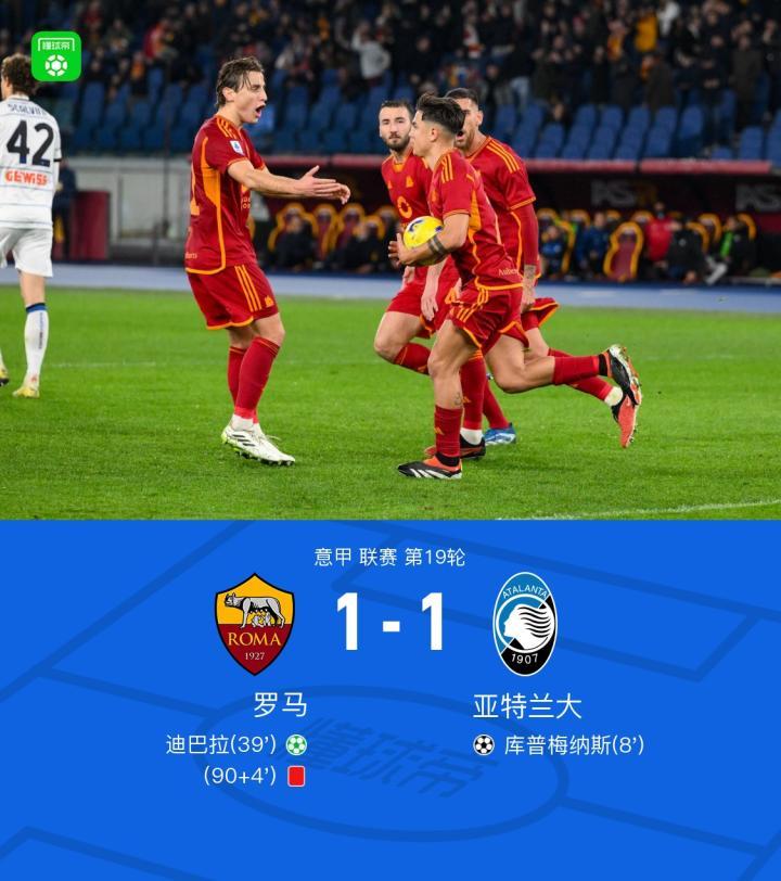 北京时间1月8日意甲 联赛 第19轮,罗马主场对阵亚特兰大。比赛上半场米兰丘克送出助攻,库普梅纳斯禁区抢点头球率先完成破门,曼奇尼抢断直塞给到卢卡库,低射打门被挡出,卡尔斯多普禁区造点,迪巴拉操刀点射命中将比分扳平,下半场迪巴拉禁区完成一脚倒钩,皮球偏出球门,斯卡马卡先有犯规推人动作,随后头球破门无效,埃德松-席尔瓦晃开角度一脚劲射打高,比赛尾声阶段,穆里尼奥不满判罚产生抱怨,裁判出示红牌,全场战罢,最终比分1-1。