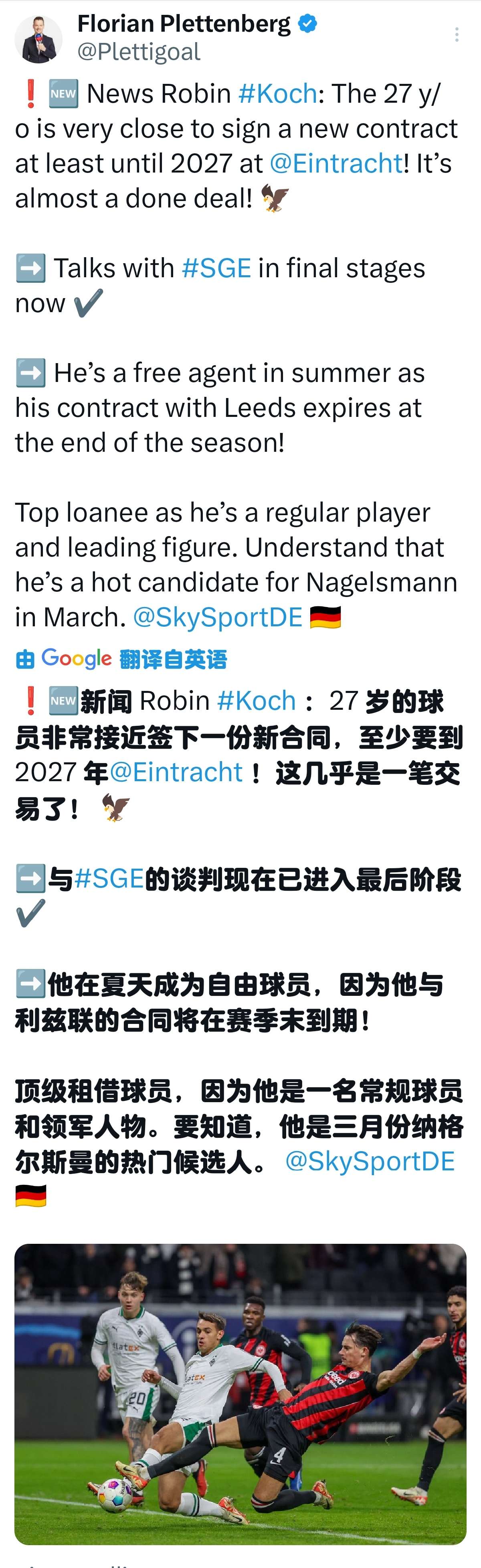 德国天空体育普莱滕贝格消息,从利兹联租借而来的科...芳雪愁言 @懂球帝2024-01-08 08:12德国天空体育普莱滕贝格消息,从利兹联租借而来的科赫在今年夏天就自由身了,他接近永久转会法兰克福。 法兰克福接近和他达成了一份最起码到2027年的合同,目前谈判已经进入最后阶段,这对法兰克福来说是一笔顶级签约。 纳格尔斯曼也考虑在今年三月份征召他进入德国国家队。展开更多