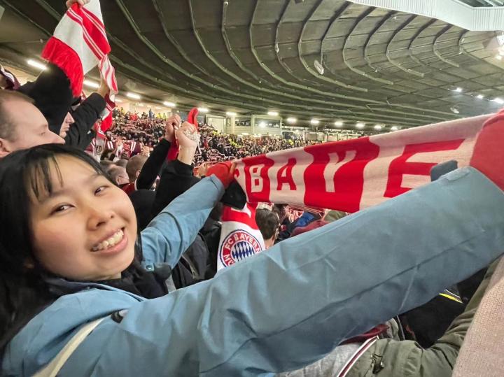 而打曼联我有幸申请到了客场票,和来自德国的远征军们一起。申请的时候说是分坐席和站席,实际大家整场比赛一直在唱跳,气氛十分火热。而我是第一次和其他饼迷们一起在客场区,刚开始还有点不适应,后来就一起唱唱跳跳啦~除了有些chant是德语我不会以外,其他一切都很开心。目前还没去过德国,想在不久的未来访问德国,去慕尼黑圣地巡礼。当然,希望我德语也能进步,目前是A1初学者。