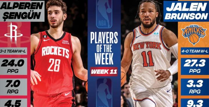 NBA上周周最佳:尼克斯后卫布伦森和火箭内线申京分别当选