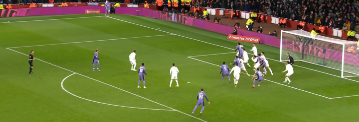 在小禁区附近负责人盯人的球员有厄德高对迪亚斯、弱鸟对努涅斯和莱斯对夸安萨,而哈弗茨在后点是面对着科纳特和若塔的2对1的局面,整体小禁区附近阿森纳防守人盯人的人数较之利物浦是存在4V5的人数劣势的,而在基于人盯人的防守球员的一项职责就是保护站区域的防守球员免受干扰这一目标上,如果将球罚向不受保护的区域,那么1对1将成必然,而这个角球的结果就是若塔在和萨力巴的1V1对抗中完成了头球攻门,萨力巴在身高有优势的情况下对于球落点的侵略性稍显不够。再考虑到大禁区线附近利物浦的3个人加阿森纳的2人,实际防守人盯人是处于6对8的劣势。