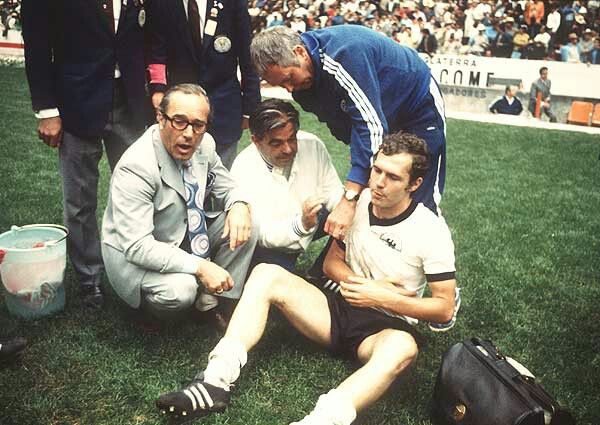 贝肯鲍尔在中场组织着进攻,他不断的向前推进,不断的寻找空档,但在下半场中段时间,贝肯鲍尔被意大利撞翻了,他的右臂骨折了。