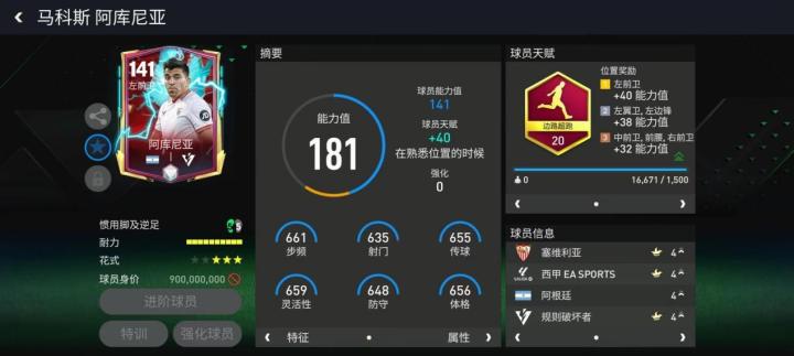阿库尼亚在游戏中多数以边后卫的身份出现,规则破坏者的这张141能力值版本位置给到了边前卫,使得他与同位置球员相比具备了绝对的防守优势,他在进攻端的表现力也得到了加强。