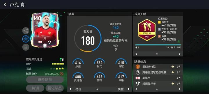 中后卫的版本的肖出镜率虽然不多,但次次都能带给人惊喜。规则破坏者活动的这张卢克肖性价非常高,140的基础能力值,却有着各项都在600以上的数据配置,搭配叹息之墙天赋,他在防守端的表现十分惊艳。