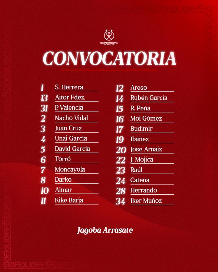 奥萨苏纳西班牙超级杯24人大名单: 门将:1-塞尔希奥·埃雷拉、13-艾托尔·费尔南德斯、31-巴勃罗·巴伦西亚 后卫:2-纳乔·比达尔、3-胡安·克鲁斯、4-乌奈·加西亚、5-戴维·加西亚、12-赫苏斯·阿雷索、15-鲁文·佩尼亚、22-霍安·莫希卡(哥伦比亚)、24-亚历杭德罗·卡特纳、28-豪尔赫·埃兰多 中场:6-卢卡斯·托罗、7-洪·蒙卡约拉、8-达尔科·布拉沙纳茨(塞尔维亚)、10-艾马尔·奥罗斯、11-基克·巴尔哈、14-鲁文·加西亚、16-莫伊·戈麦斯、19-巴勃罗·伊瓦涅斯、34-伊克尔·穆尼奥斯 前锋:17-安特·布迪米尔(克罗地亚)、20-何塞·曼努埃尔·阿奈斯、23-劳尔·加西亚 主教练:哈戈瓦·阿拉萨特 信息参考来源:奥萨苏纳俱乐部官网 https://www.osasuna.es/news/read/2587