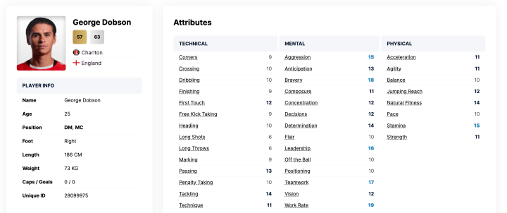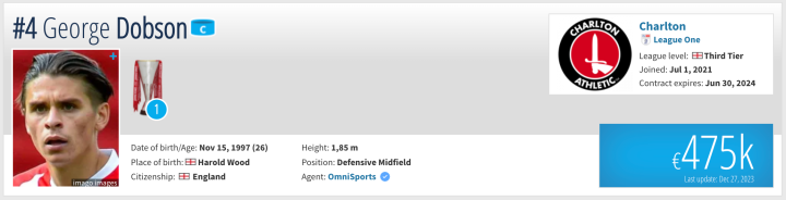 乔治-多布森,1997年出生于伦敦黑弗灵伍德。身高185CM,场上司职后防守型后腰。现效力于英甲查尔顿俱乐部。