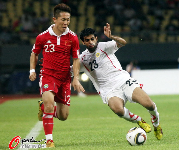 但好景不长,巴林队虽然落后,但整体打法仍然坚决贯彻脚教练意图,不断冲击中国队球门。第16分钟,巴林队将比分扳平,M-拉希德前场利用空裆送出直塞球,何扬铲截慢了半拍,哈桑距离球门八米处扫射皮球碰何扬脚部稍变线入网,1-1!巴林队扳平比分。