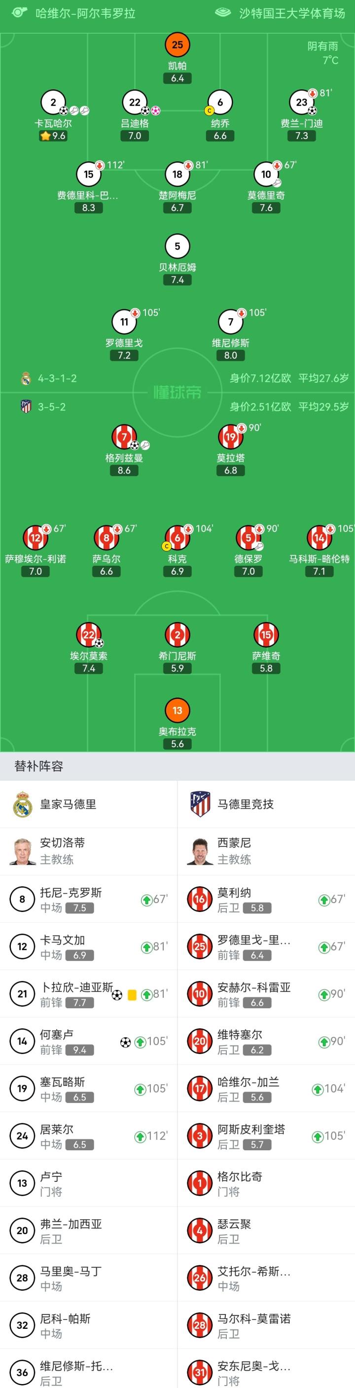替换下场:67'10-莫德里奇, 81'23-费兰-门迪, 112'15-费德里科-巴尔韦德, 81'18-楚阿梅尼, 105'7-维尼修斯, 105'11-罗德里戈