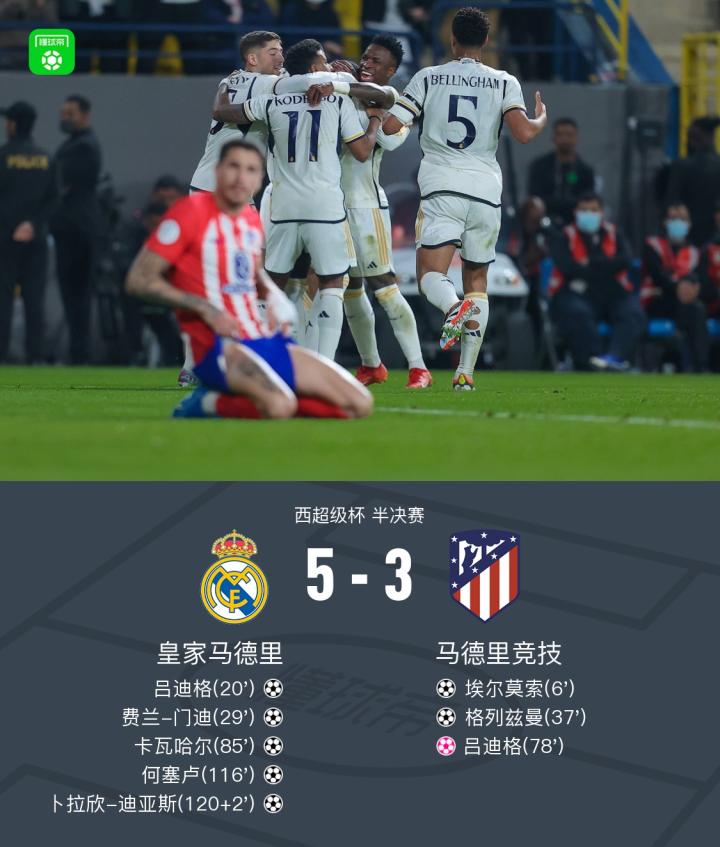 北京时间1月11日03:00,西班牙超级杯半决赛在沙特国王大学体育场展开争夺,皇家马德里对阵马德里竞技,本场主裁判为阿尔韦罗拉。上半场,格列兹曼助攻埃尔莫索头槌闪击,随后吕迪格与门迪先后破门助皇马实现逆转,紧接着格列兹曼凭借个人能力远射扳平+独享队史射手王。下半场,吕迪格运气不佳打入乌龙球,卡瓦哈尔补射绝平。加时赛尾声阶段,何塞卢替补传射,迪亚斯抓住奥布拉克弃门参与进攻超车打空门锁定胜局。最终,皇马鏖战加时5-3力克马竞,晋级西班牙超级杯决赛。