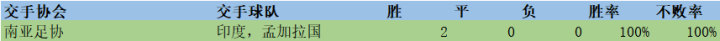 在对抗各协会球队的历史上,国足有一项骄人纪录,在亚洲杯正赛阶段全胜来自南亚足联的球队。总战绩为2胜,胜率为100%。