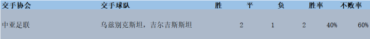 在对阵中亚足联的球队中,国足一共交手5次,总战绩为2胜1平2负,胜率40%。