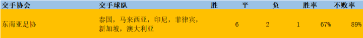 而在面对来自东南亚足联的球队上,如果不算上2013年才加入东南亚足联的澳大利亚队的话,国足对阵东南亚足联的球队在亚洲杯正赛历史上也是未尝败绩,总战绩为6胜2平1负(唯一一场失利来自于2015年亚洲杯对阵东道主澳大利亚队),胜率为66.7%。
