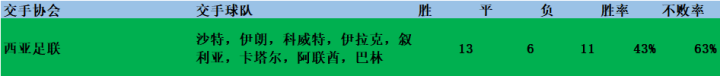 而在对抗西亚足联球队的战绩上,国足似乎并未有想象中不堪。(由于伊朗足协在2015年才正式加入中亚足联,且其历史上参加亚洲杯大部分时间均作为西亚足协成员参赛,因此在统计时依然将伊朗队算作西亚足协成员)在亚洲杯正赛阶段总计30次与西亚球队的交手中,国足一共取得了13胜6平11负,胜率为43.3%,总战绩稍稍占优。