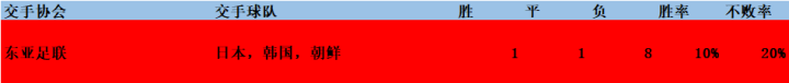但可能令不少人意料之外的是,国足最大的苦主来自于东亚足联。在对阵同样来自东亚足联的球队上,国足一共交手10次,仅取得了1胜1平8负的战绩,胜率仅为10%,唯一的一场胜利来自于2015年亚洲杯小组赛面对朝鲜队。