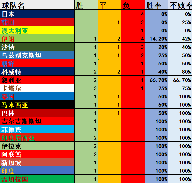 以下是国足在亚洲杯正赛阶段交手过所有球队的胜率,国足在迄今为止所参加过的所有12届亚洲杯正赛上一共遭遇过21个对手,占亚足联总会员协会总数的44.6%。 在这其中,国足面对14支球队在总交锋战绩上占据优势,与朝鲜队战绩完全持平,而余下的6支球队,国足在于他们的总战绩上处于劣势。这些球队分别是日本,韩国,沙特,伊朗,澳大利亚以及乌兹别克斯坦。