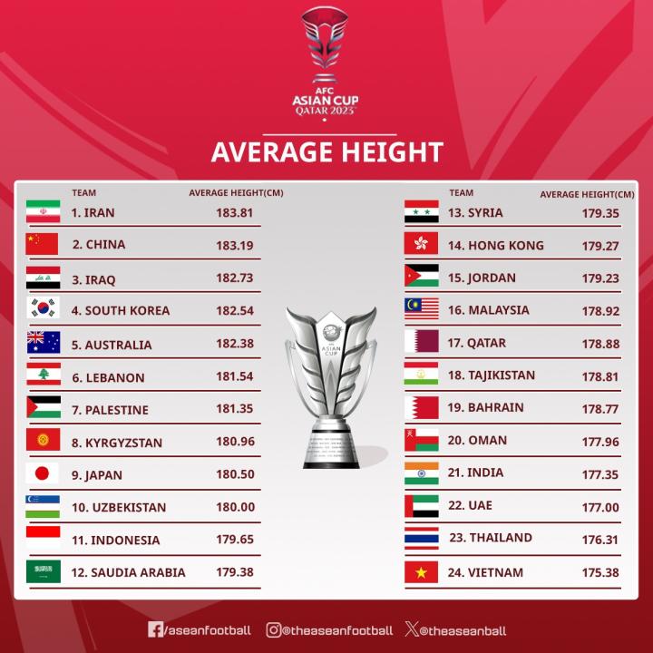 据统计,此次出征亚洲杯,中国男足全队的平均身高达到183.19cm,仅次于伊朗(183.81cm)在本届赛事中排名第二。国足同组对手中的黎巴嫩平均身高为181.54cm,而塔吉克斯坦与卡塔尔的平均身高则均未达到180cm。此外,越南队的平均身高仅为175.38cm,是本届赛事平均身高最矮的球队。