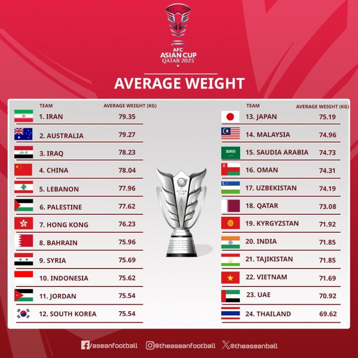体重方面,中国队的平均体重为78.04公斤,落后伊朗、澳大利亚与伊拉克在本届赛事中排名第四。泰国队的平均体重则仅有69.62公斤,是本届赛事中“最轻”的球队。