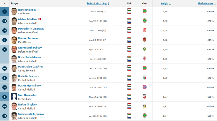 以最新一期的大名单为例,有多达五人是在俄罗斯接受的青训,分别有四位中场(乌马尔巴耶夫、贾利洛夫、海洛耶夫、茹拉博耶夫)和一位门将(亚蒂莫夫),其中前两位入选过俄罗斯的国青队。再把时间线往前推一个周期,还有贾利洛夫的两个堂兄、苏莱马诺夫、图尔苏诺夫、瓦西耶夫等多人是俄罗斯青训出身,可以说这些长在俄罗斯的塔吉克二代为他们的国家队进军亚洲杯立下了汗马功劳。目前俄罗斯仍有几名无需归化手续就可以代表塔吉克斯坦出战的悍将,其中不乏征战过俄超的人,可惜他们代表故乡的意愿不强。