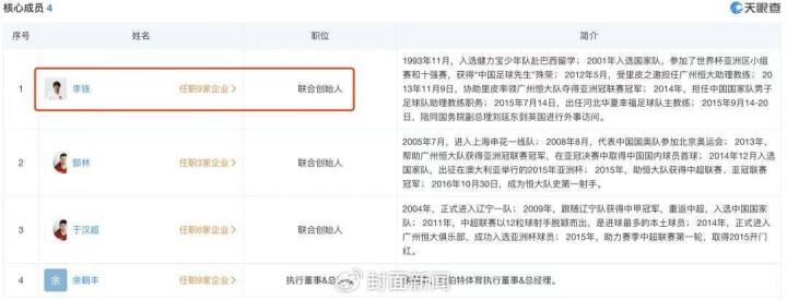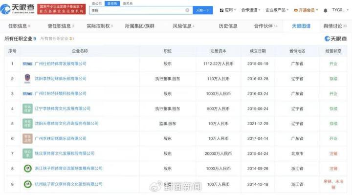 天眼查显示,李铁共关联9家企业,其中6家为存续、开业状态,包括广州仕伯特体育发展有限公司、沈阳李铁足球俱乐部有限公司、广州仕伯特环境科技有限公司(曾用名为广州仕伯特体育设备有限公司)等,这些公司均与体育相关,涵盖足球培训、球员经纪与场馆运营等各个环节。
