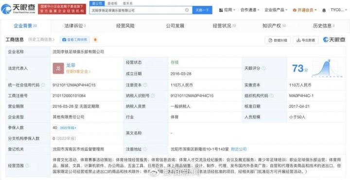 除了在国家队执教时期的敛财,李铁还将沈阳的公益8号公园常年据为己有,通过建造青少年足球训练场和出租承办体育活动,每年营业额高达数千万。根据李铁8号足球公园微信官网账号,其运营主体为沈阳李铁足球俱乐部有限公司,该公司的法定代表人为李铁妻子龙菲,李铁在该企业担任执行董事。