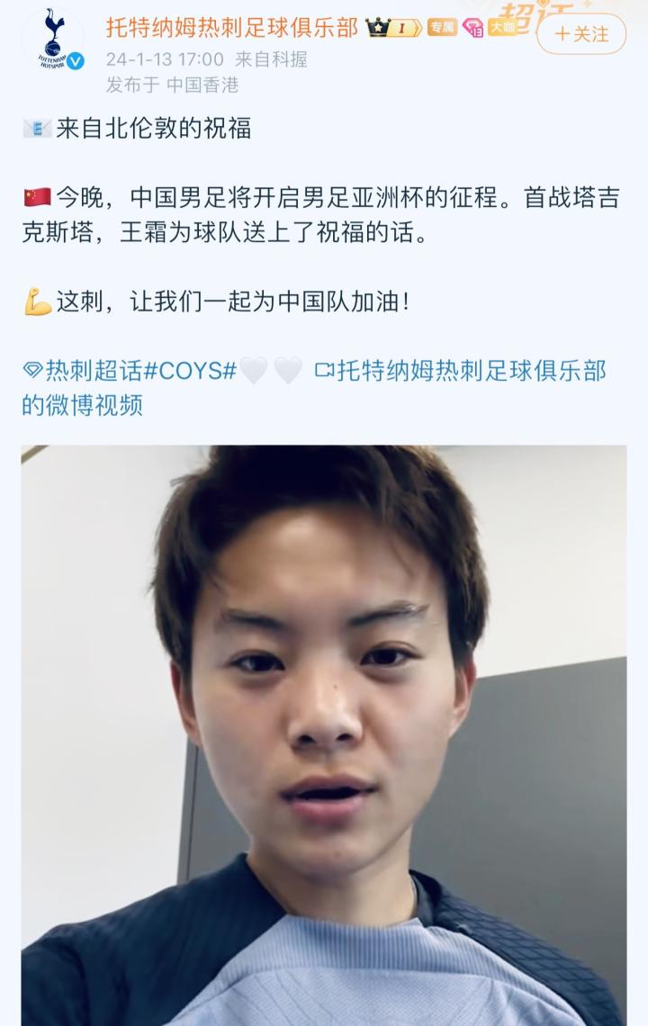 热刺官方写道:“来自北伦敦的祝福!今晚,中国男足将开启男足亚洲杯的征程。首战塔吉克斯坦,王霜为球队送上了祝福的话。这刺,让我们一起为中国队加油!”