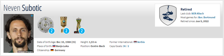 塞尔维亚国脚苏博蒂奇在2022年6月9号宣布退役。他绝对算多特功勋球员了。身高193,且有着不慢的回追速度,巅峰时期绝对是完美后卫。职业生涯共为大黄蜂出场263次。他在2018年离开效力10年的多特。此后在法甲圣埃蒂安,德甲柏林联合。以及土耳其,奥地利联赛都留下了他的身影。