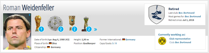 灯叔是大黄蜂传奇门将,队史出场453场,位居门将第一。在当年的那支多特是无可替代的角色。他也随德国队夺得了2014年世界杯冠军。职业生涯只效力过多特蒙德和凯泽斯劳滕。忠臣的代表。他在2018年7月宣布退役。去年还来中国参加过活动。帅气依旧。