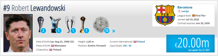 无论承认与否,莱万都是近十年世界足坛最强中锋之一。多特时期的他并没有达到职业生涯的巅峰,但已经是个非常强力的前锋了。出场187次,打入103球助攻42次。儿仁梦当时没少挨球迷谩骂。如今的莱万已年满35岁,和拜仁巅峰时期是没法比较了。但仍然是巴萨的绝对得分点。