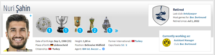 2013年的那支多特,替补席上还坐着这位加盟过皇马,利物浦的中场天才球员。沙欣在加盟皇马之前,是德甲的超级新星。此后,发展未达到预期。仅2年时间就再度回归多特。他为多特前后出场274次,有26球49助攻。
