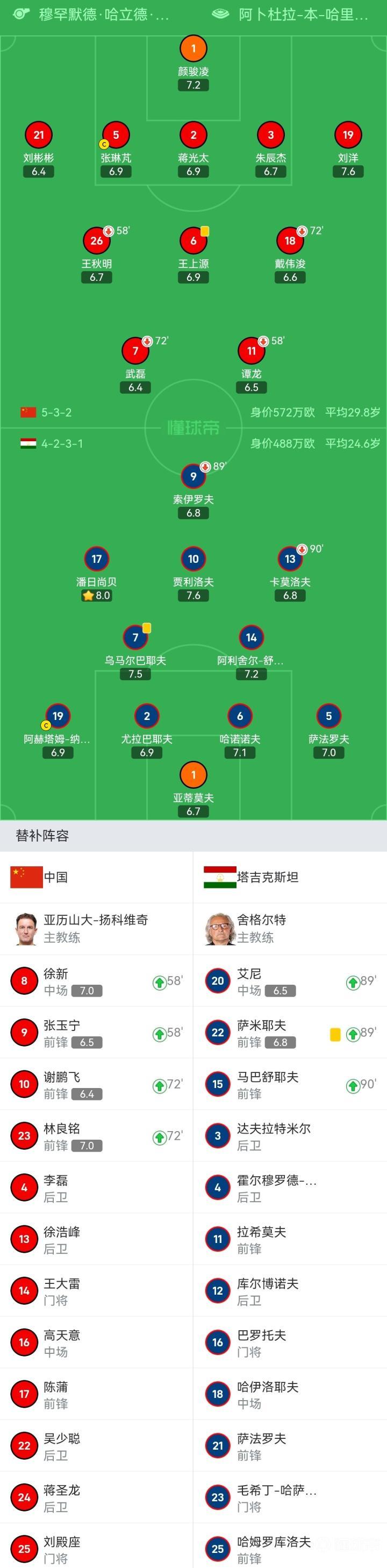塔吉克斯坦首发:1-亚蒂莫夫、5-萨法罗夫、6-哈诺诺夫、2-尤拉巴耶夫、19-阿赫塔姆-纳扎罗夫、14-阿利舍尔-舒库罗夫(89'22-萨米耶夫)、17-潘日商贝、7-乌马尔巴耶夫、10-贾利洛夫、9-索伊罗夫(89'20-艾尼)、13-卡莫洛夫(90+6'15-马巴舒耶夫)