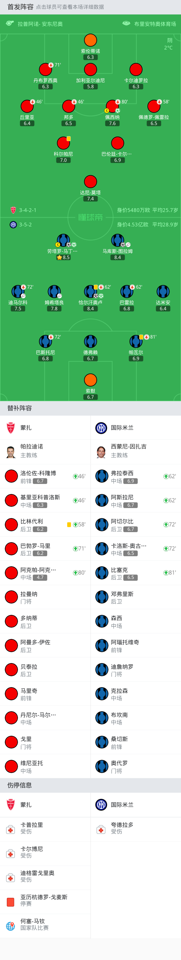 蒙扎首发:5-卡尔迪罗拉, 33-丹布罗西奥, 6-加利亚尔迪尼, 32-佩西纳, 84-丘里亚, 13-佩德罗-佩雷拉, 47-达尼-莫塔, 28-科尔帕尼, 23-索伦蒂诺, 38-邦多, 21-巴伦廷-卡尔博尼