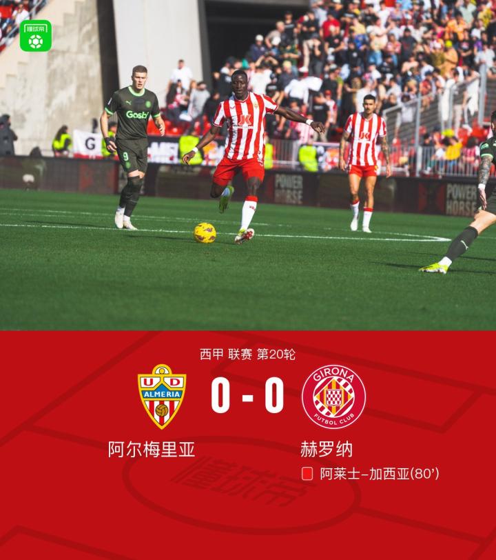 北京时间1月14日西甲 联赛 第20轮,阿尔梅里亚主场对阵赫罗纳。阿莱士-加西亚在比赛尾声阶段被直接红牌罚下,最终比分0-0。