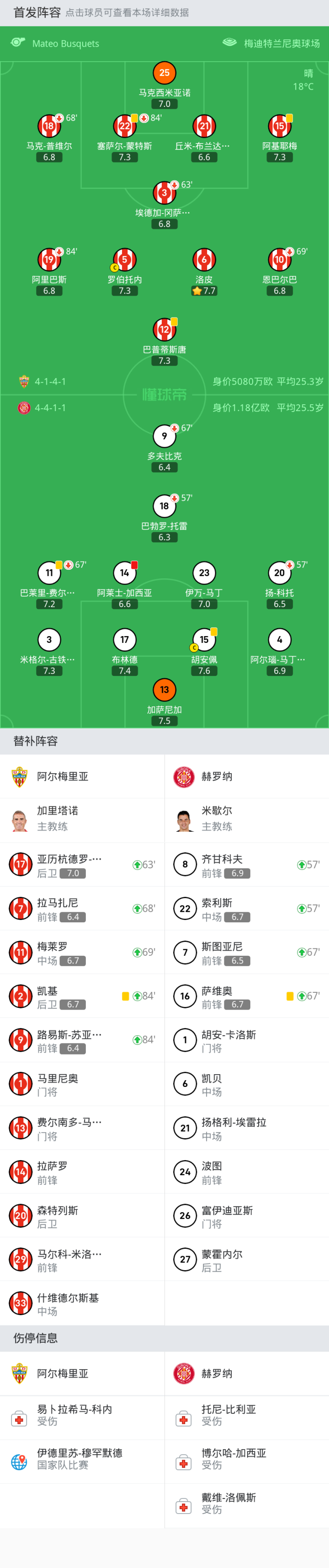 阿尔梅里亚首发:12-巴普蒂斯唐, 10-恩巴尔巴, 21-丘米-布兰达里斯, 3-埃德加-冈萨雷斯, 15-阿基耶梅, 22-塞萨尔-蒙特斯, 25-马克西米亚诺, 5-罗伯托内, 6-洛皮, 19-阿里巴斯, 18-马克-普维尔