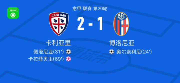 北京时间1月14日意甲 联赛 第20轮,卡利亚里主场对阵博洛尼亚。卡利亚里佩塔尼亚破门。博洛尼亚奥尔索利尼破门,卡拉菲奥里自摆乌龙。最终比分2-1。