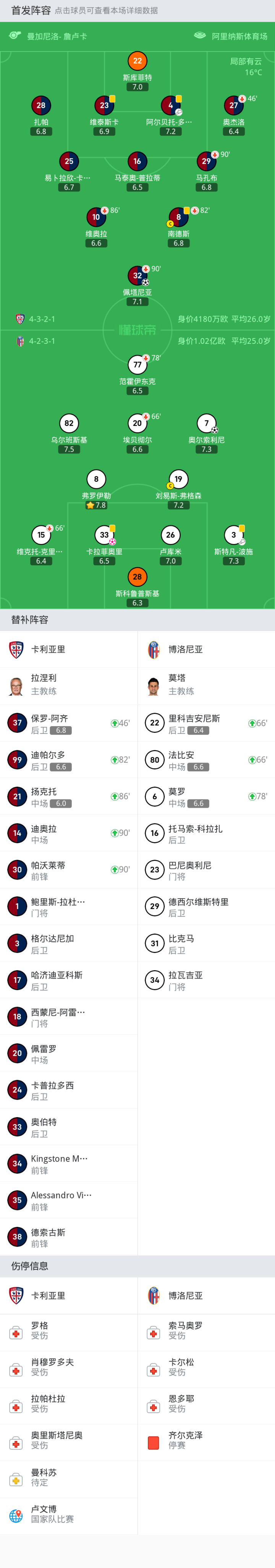 卡利亚里首发:10-维奥拉, 27-奥杰洛, 22-斯库菲特, 23-维泰斯卡, 32-佩塔尼亚, 8-南德斯, 4-阿尔贝托-多塞纳, 29-马孔布, 28-扎帕, 16-马泰奥-普拉蒂, 25-易卜拉欣-卡卡里