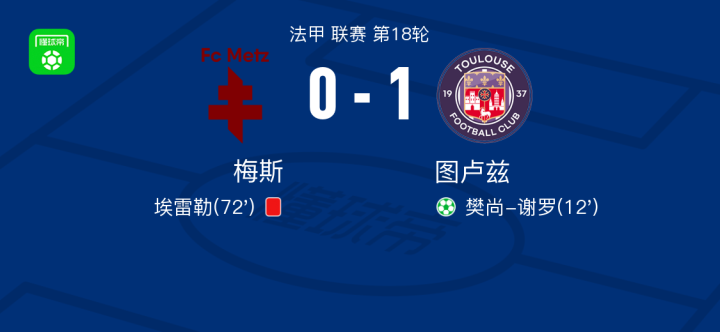 北京时间1月14日法甲 联赛 第18轮,梅斯主场对阵图卢兹。梅斯。图卢兹樊尚-谢罗破门。最终比分0-1。